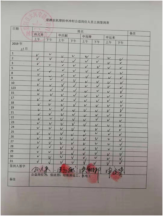 亞澳農(nóng)機每月給公益崗位貧困戶工作人員發(fā)放工資500元/月人