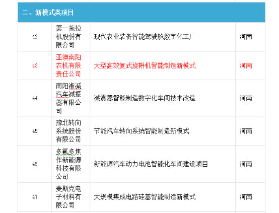 亞澳農(nóng)機(jī)被國(guó)家工信部評(píng)為2017年智能制造綜合標(biāo)準(zhǔn)化與新模式應(yīng)用項(xiàng)目名單